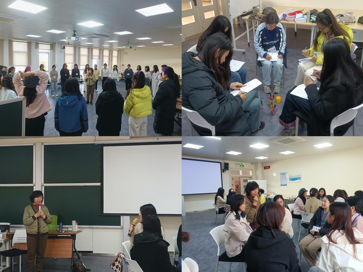 为期两天的工作坊活动中,“用自己的特征加一个动作来介绍自己”是蔺老师与同学们的破冰初识,她以亲身经历向同学们介绍萨提亚家庭治疗的主要内容,通过情境表演和小组活动的方式带领同学们深入了解萨提亚治疗模式中的冰山理论和五种沟通模式。