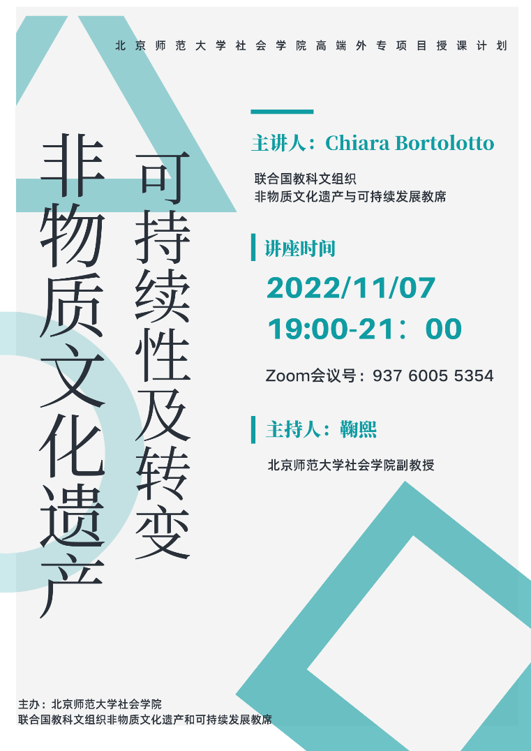 主讲人简介:Chiara Bortolotto教授现任职于法国巴黎塞尔吉大学,担任联合国教科文组织非物质文化遗产和可持续发展讲席教授,兼任瑞士日内瓦大学高级讲师。她是意大利米兰语言与传播自由大学艺术、文化和比较文学研究所和法国社会科学高等研究学院人类学和文化机构历史研究所的博士后,先后在比利时布鲁塞尔自由大学世界当代人类学实验室、英国剑桥大学、法国社会科学高等研究学院当代人类学跨学科研究所担任研究员和访问学者。她的主要研究领域是非物质文化遗产和可持续发展,全球治理问题,发表了多篇论文并出版了系列作品。